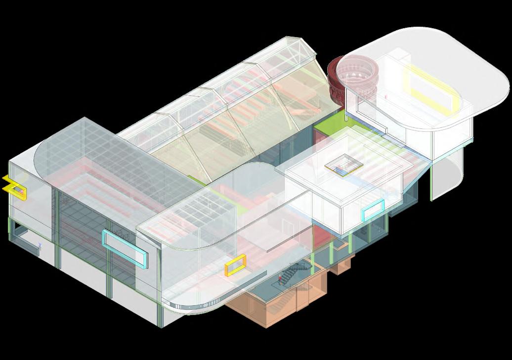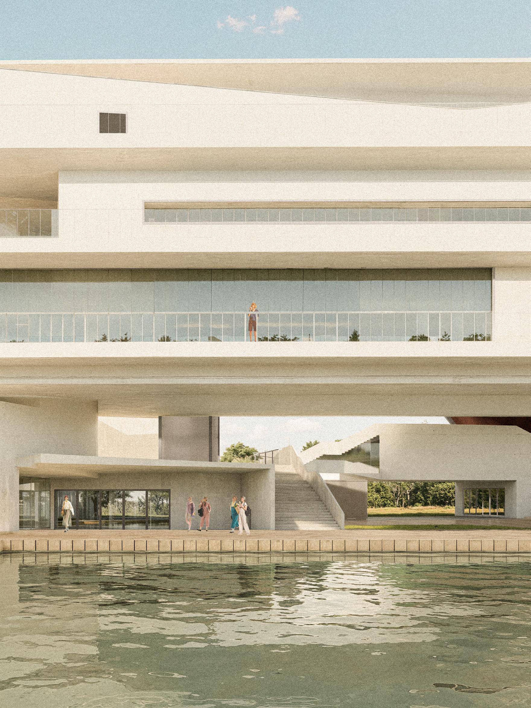 The building is structured around two primary cores that link all programmatic components. Three tempered-glass elevator shafts enhance vertical circulation with a high degree of transparency, enabling visitors to visually engage with the interior and clearly understand where they are headed.