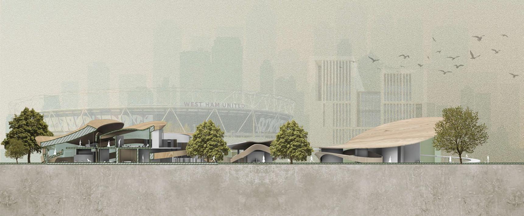 This project in Stratford, London, situates itself on the southern side of the Queen Elizabeth Olympic Park. Positioned adjacent to the canal and allotment, it serves as a sustainable material workshop together with a series of talks and lessons where students delve into the connection between humans and nature. Through material experimentation and artistic creation, they explore how we can intricately respond to nature's call. At its core, this initiative strives to bridge the gap between humanity and nature, fostering a deeper emotional connection and empathy towards our natural surroundings.