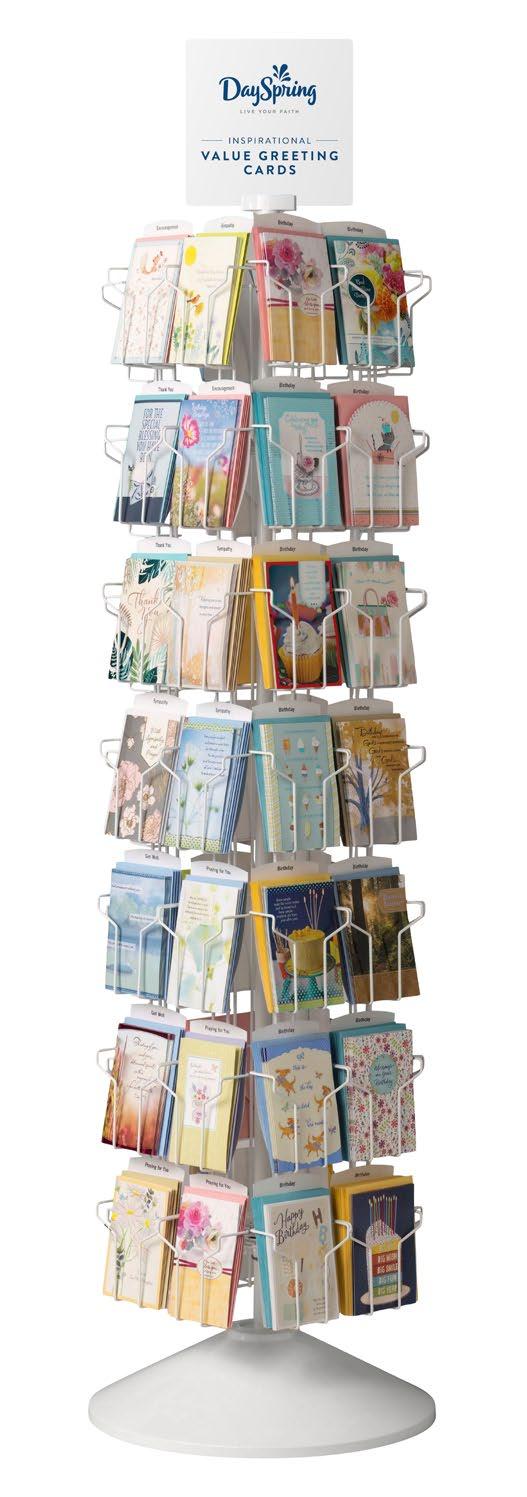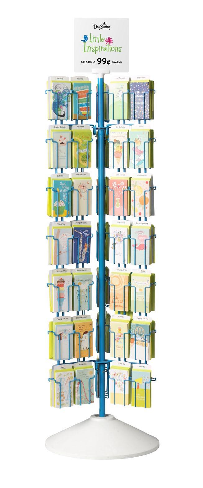 DaySpring’s Inspirational Spinner is designed to display core products: DayBrighteners® and Everyday Boxed Cards. The spinner holds 4 sides of product. Images of displays are for reference only.