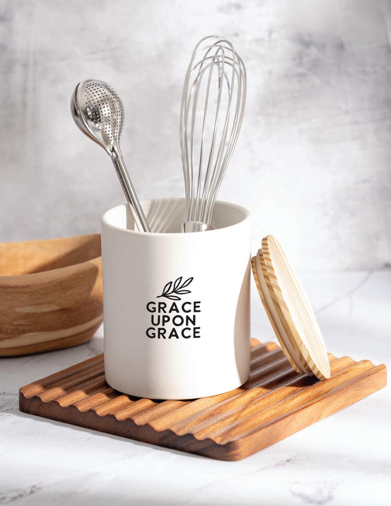The Gathered Goods Canister perfectly blends farmhouse charm and versatile functionality. Its compact size makes it ideal for storing small essentials in every room of your home. In the kitchen, use it to hold utensils, sugar, tea bags, coffee grounds, or spices while keeping them fresh with its airtight wooden lid. In the bathroom, it’s excellent for organizing cotton balls, bath salts, or small toiletries. Add it to your office for storing paper clips or loose change, or place it on a vanity to keep jewelry safe. The creamy ceramic design and natural pine lid complement any décor, making this canister a stylish and practical solution for everyday storage needs that will encourage your family and friends.