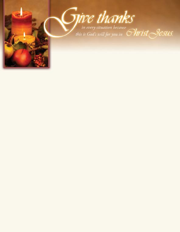 Thanks In Every Situation 1 Thess 5:18 CEB U3989 730817368245 Bulletin $8.99/100 U3989L 730817368252 Legal Bulletin $9.99/100 U3989LH 730817368269 Letterhead $8.99/100 U3989B 730817368283 Bookmark $3.89/25 U3989E 730817368276 O ering Envelope $9.79/100