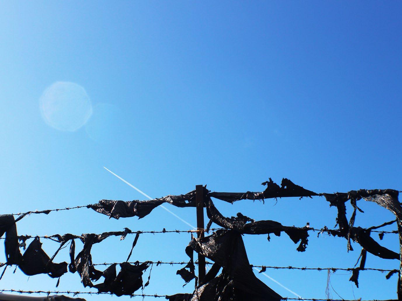 High wall surrounding the Aldi store. Situated 1 minutes’ walk from the Square NCW. The wall is topped with barbed wire with black bin liners tangled and shredded by the wind, creating abstract shapes A plane in the distance offers depth to the viewer and maybe a glimpse of adventure, as it fly’s towards the sun.