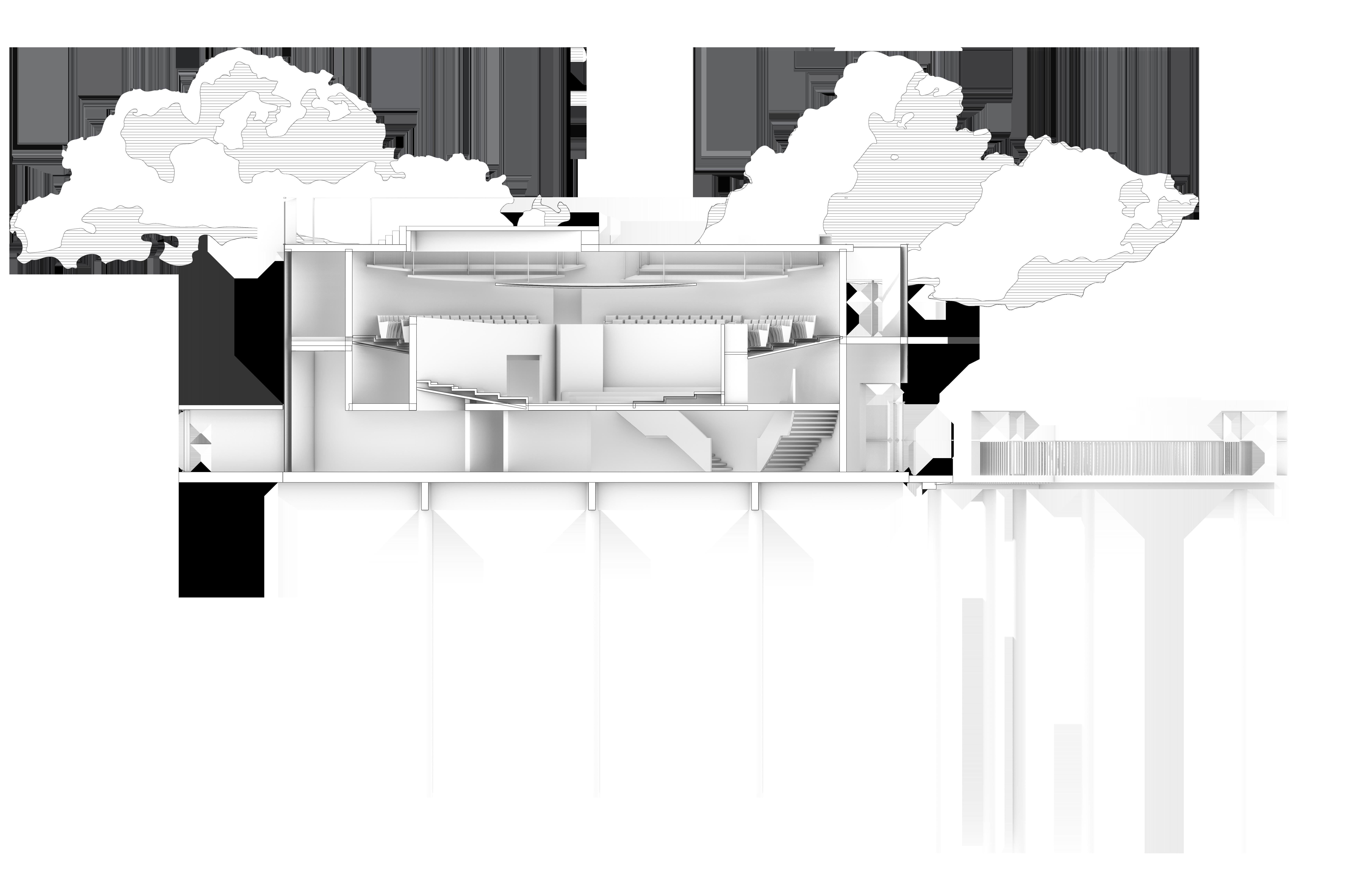 Corridors and foyers twist and turn, creating a sequence of spaces that lead visitors on an almost cinematic journey towards the main auditorium