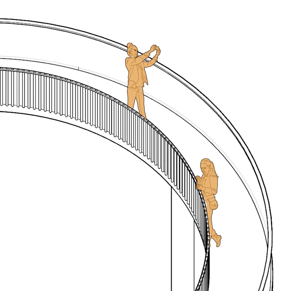 Drawing inspiration from Indigenous art, the design begins with three circular forms—one positioned onshore, linking the structure to the park, while the other two float on the water. A sweeping, arched bridge gracefully connects these three points, embodying the circular motif that allows for panoramic views. The circular shapes, rooted in Indigenous symbolism, frame an expansive perspective, inviting a harmonious connection between land and water. ●