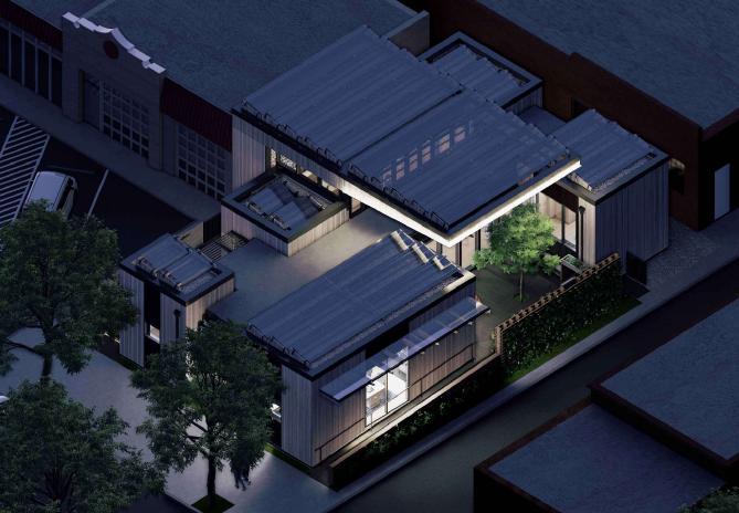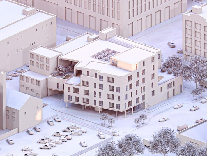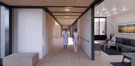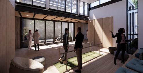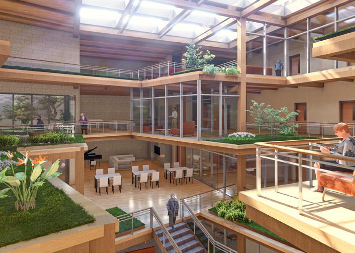“Grove Care” is CLT-structured assisted living and memory care facility designed to address the growing need for senior care due to an aging population. The facility features a biophilic design with lush greenery cascading over multiple levels both indoors and outdoors, promoting wellness, social interaction, and connection with nature