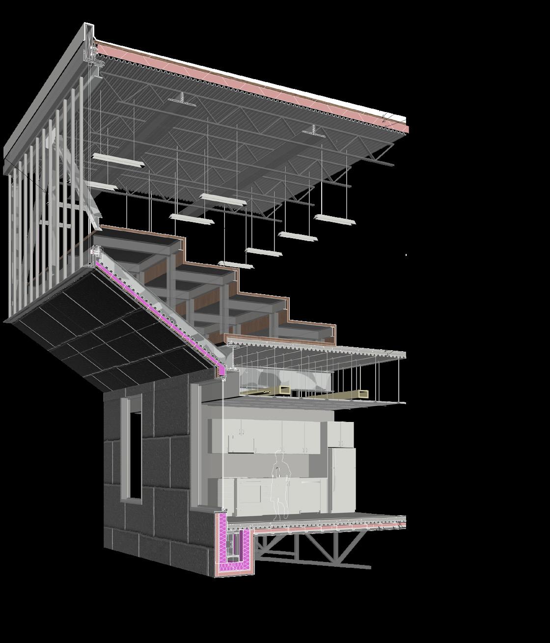 Summer Solctice Winter Solctice Enclosure2: Steel Stud with Polyiso and Fiber Cement Siding Size:10'x4' Advantages: Lightweight fiber cement panel, can be easily transformed into any shape, can be perforated, printed or routed, durable, resistant to extreme temperatures and frost, water-resistant, environmentally friendly 6" Ploy ISO Rigid Insulation 2" Metal Deck Bar Joist Truss Hard Board TPO Roofing Bridging Truss Rood Assambly Floor Assambly Lightwall www.autodesk.com/revit Consultant Address Address Address Phone Consultant Address Address Address Phone Consultant Address Address Address Phone Consultant Address Address Address Phone Consultant Address Address Address 1. **Weather Resistance and Durability:** - The air gap helps to create a barrier to withstand extreme weather and provides natural ventilation, helping to keep insulation moisture-free. 2. **Energy Efficiency:** Enclosure1: Polycarbonate Wall Summer Solctice Winter Solctice Carpet 4 1/2" Poured Concrete 2" Metal Deck 6" Ploy ISO Rigid Insulation 2" Metal Deck Bar Joist Truss Hard Board TPO Roofing Bridging Truss Rood Assambly Floor Assambly Polycarbonate Lightwall Exterior Ceiling Assambly Wide Flage Beam Suport Runner Ceiling Suport Acoustical tiles Suspended Ceiling 2" Metal Plate Hardboard Sheathing Reigid Insulation Z-Girt Air Barrier Fiber Cement Panel Exterior Platform Assambly Bituminous Concrete Poured Concrete Metal Plate Wide Flange Beam supported by Retaining 33.00° 79.00 ° 1. **Weather Resistance and Durability:** - The air gap helps to create a barrier to withstand extreme weather and provides natural ventilation, helping to keep insulation moisture-free. 2. **Energy Efficiency:** - The light transmission of double polycarbonate panels is approximately 85%, creating less condensation. Because air can be trapped between the walls, the increase in energy efficiency reduces heating costs by as much as 50%. 3. **Cost-Effective:** -lightweight, easy to install and constumize. 4. **Longevity and Sustainability:** - Healthy material, fire-resistant . Enclosure1: Polycarbonate Wall Summer Solctice Winter Solctice Enclosure2: Steel Stud with Polyiso and Fiber Cement Siding Size:10'x4' Advantages: Lightweight fiber cement panel, can be easily transformed into any shape, can be perforated, printed or routed, durable, resistant to extreme temperatures and frost, water-resistant, environmentally friendly Auditorium Classroom Acoustic Panel Assambly Aluminum Perforated Panel Fabric 5 D Acoustic Wall Assambly Fiber Cement Exterior Wall Assambly (R =10/in) 5/8" Gypsum Board Finish 6" Metal Stud @ 24" O.C. 1" OSB Sheathing 1/16" Water Resistant Barrier (WRB) 2" Rigid Insulation Air Gap 5/16" Fiber Cement Panel 6" Glass Fiber Batt Insulation Fiber Cement Panel Installation Hat Channel Bolts www.autodesk.com/revit Consultant Address Address Address Phone Consultant Address Address Address Phone Consultant Address Address Address Phone Consultant Address Address Address Phone Consultant Address Address Address Phone No.DescriptionDate Serveice/Secondary Entrance for Dormitary Main Entrance Need 2 access points because: The distance from the fire truck to the furthest point is more than 150 feet. Fire lane is 20 feet wide fully outdoor space. All-weather Surface No dead-ends longer than 150ft Around space for fire truck is with typital 25' radius. Site Plan 0 5ft 10ft Wall Section 3D Enclosure 1: Polycarbonate Wall SECTION 084519 / EXTECH Enclosure 2: Fiber Cement Siding + Wall Detail SECTION 074646/ EQUITONE Wall Section 2D