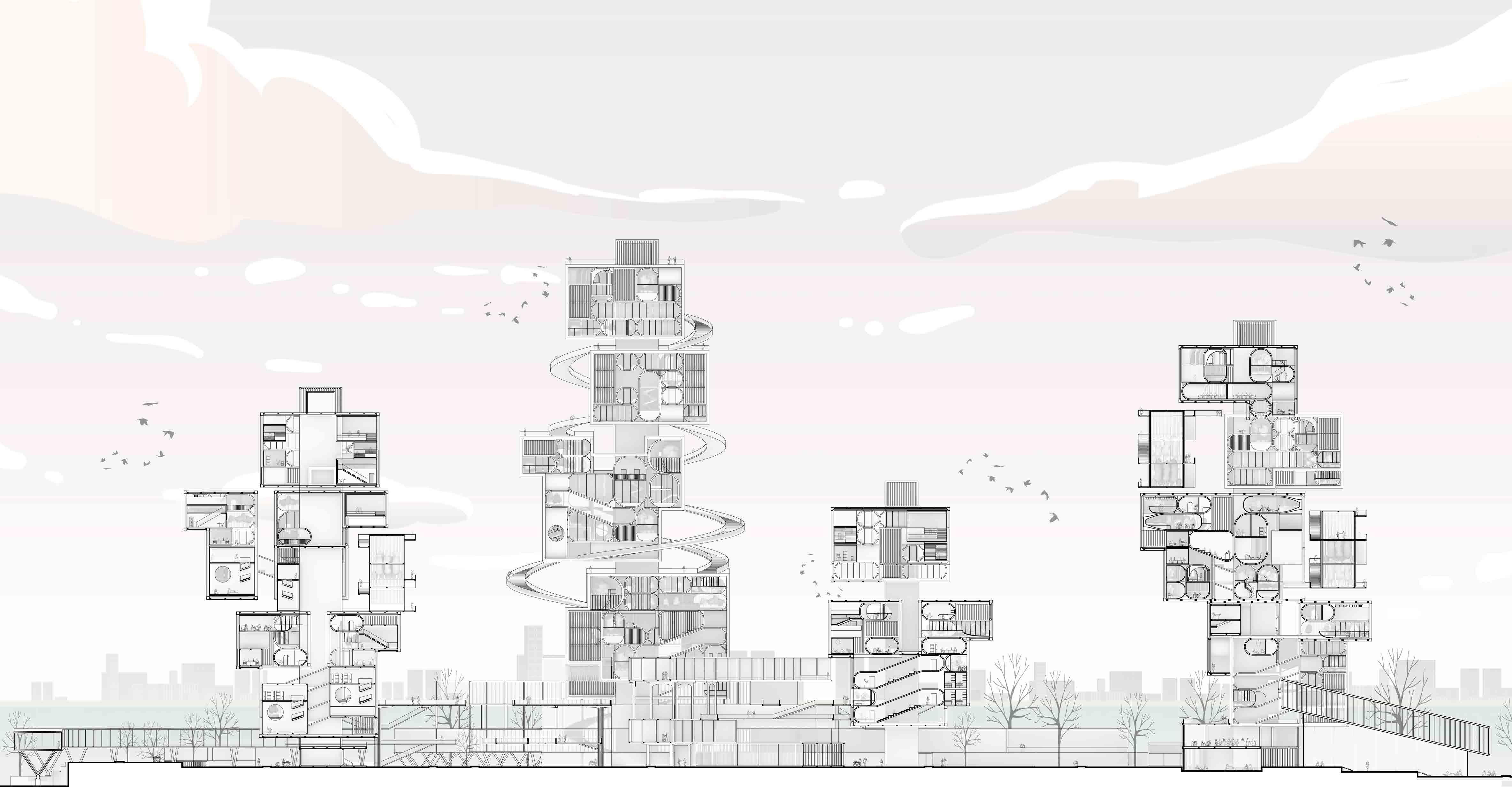A typical Bohemian family consists of three generations, the grandparents and their sons and daughters-in-law, and the sons and daughters-in-law's children, reflecting the heavy family values of Bohemians. The towers in the project are inspired by this extended family system, and are symbolized through prefabricated modules, extended family group, community. The large family group is placed on the core tube in a suspended structure.