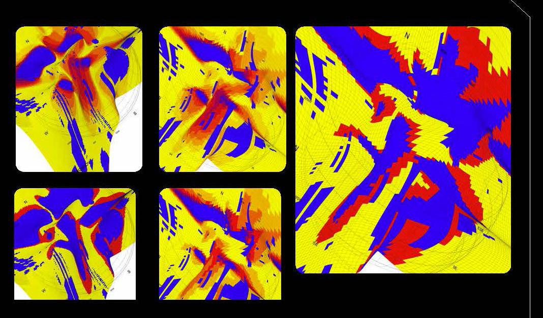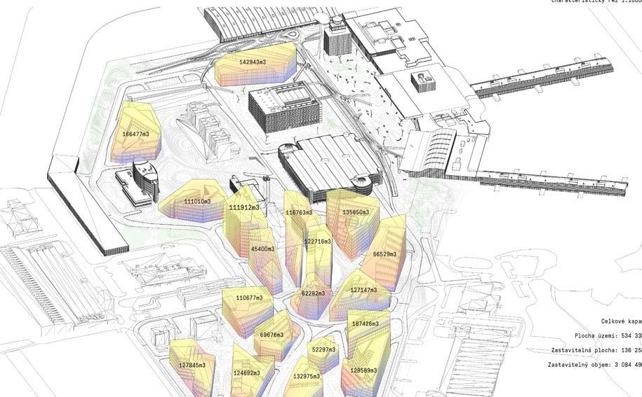 measured area creates a sunbathing gradient where it is easy to increase the accuracy of the high resolution measurement. Another key moment is the number of envelope polygon checkpoints. With only 4 polygon vertexes, there is a relatively simple cut of the block, but when vertex increases, we reach far more complex envelopes. / Fig. 2 / The envelope tendency then naturally accents the corners and creates a rich platform that very well develops the original language of the city. In a situation where several envelopes are generated, we achieve great complexity and richness of structure while maintaining a unified and coherent language. The resulting architecture reminds of its rich and self growing city.