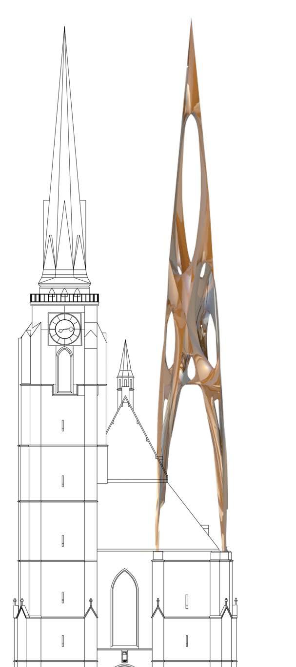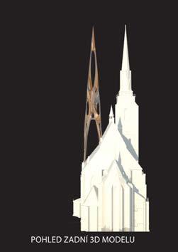 The design of the second tower of the Pilsen Church of St. Bartholomew is based on the geometry of the existing tower. The analysis of geometry shows the basic position on the square, which is offset in the ledge. The base of the roof is built on an octagon and the top of the tower is pushed to the point. The height of the individual geometric formations is placed in accordance with the existing template. Between the layout control objects / diagrams /, we generate a new control surface to maintain the longitudinal and transverse views. The basic reasoning assumes the tower as a skeleton structure derived from a gothic model without a material filling. This creates a discussion between the two towers. Functionally, there is no need to load the assignment. Lightweight steel frame construction is applied by components to the generated control surface. The component is based on a square and rotated hexagon with rounded edges. The number of