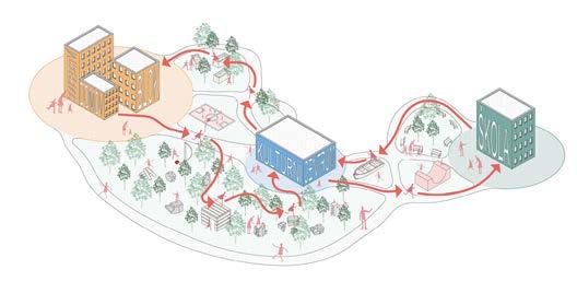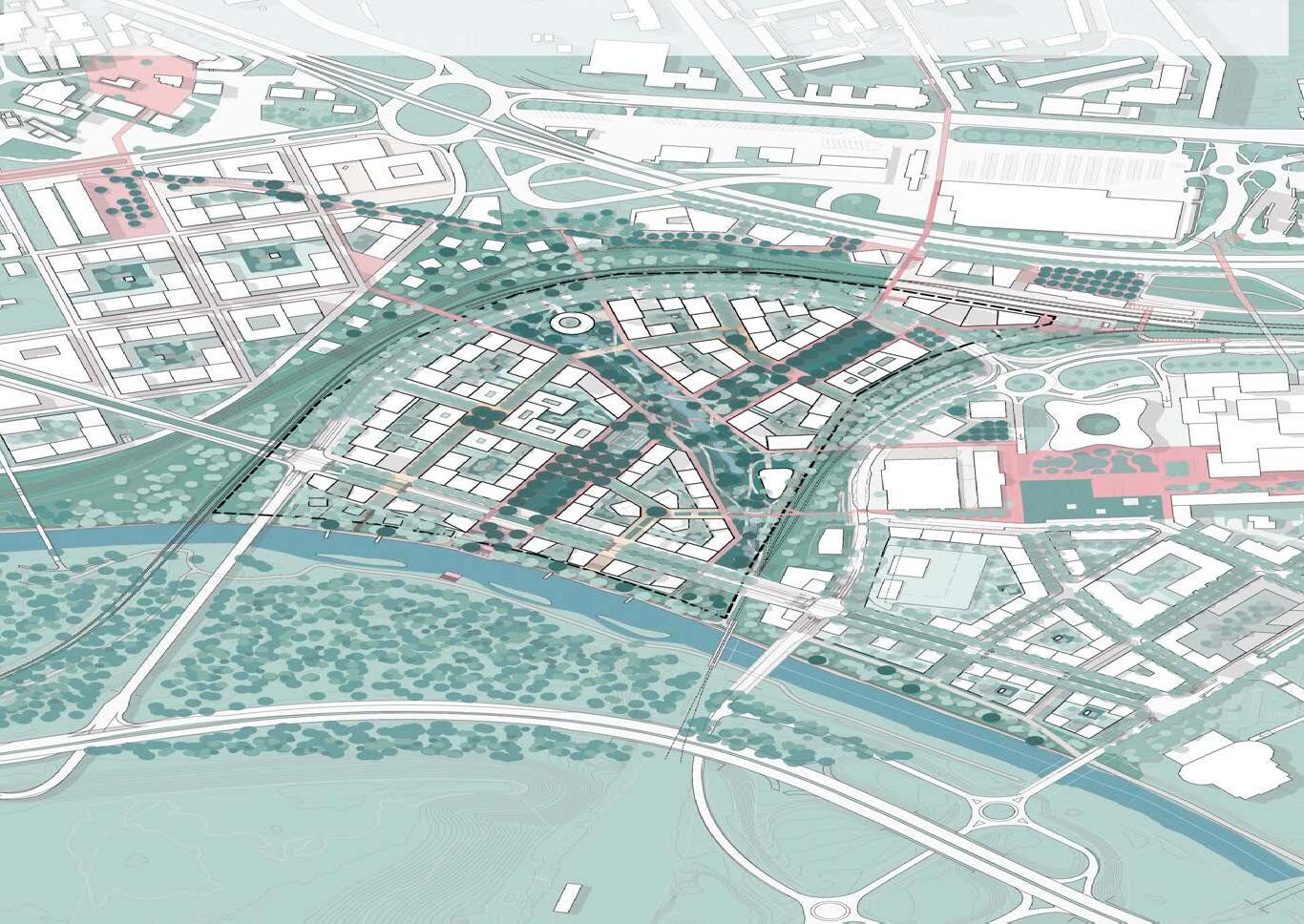 The plan promotes walkability, child-friendly design, and ecological continuity. A clear public space hierarchy—from block courtyards to civic boulevards—supports everyday life. New mobility structures prioritize pedestrians, bikes, and transit, while car access is minimized and consolidated underground.