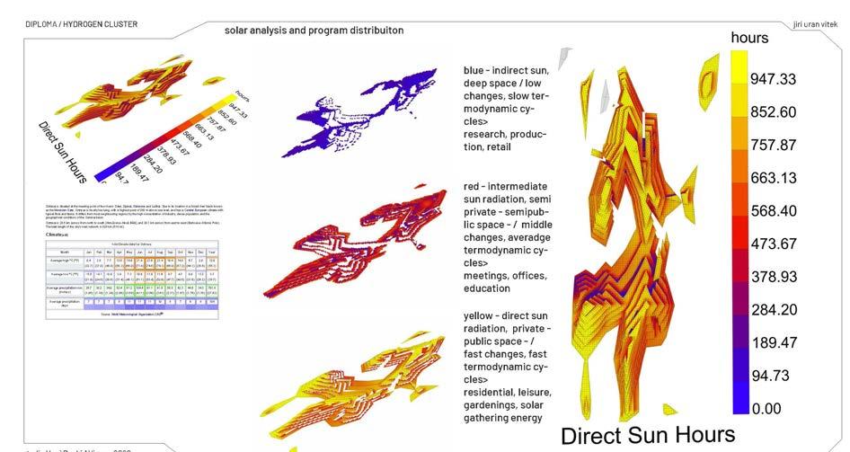 One of the key theme how to define a space or regulate a city is a solar envelope. This concept is based on “ zoning Low “ produced by Hudge Ferrise and research of Ralph L. Knowlese, who define a solar envelope as basic urban tool. The solar envelope defines the maximum possible built-in volume with respect to the shading of neighboring envelope objects. The envelope determines the polygon of the building plot, which can be from geometric primitives to rugged polygonal shapes. There is no flat roof. The top points are joined by a polygon and create a differently sloping roof area according to a specific context. Using the genetic algorithm, we are looking for the optimal solution to the set points, maximum volume and maximum exposure to the sun. The program can look at a large number of envelopes at a time, so the system looks for such a possibility that the whole newly proposed part takes into account the shadowing of itself and the context of the place, ie the surrounding objects, therefore, no block objects / maximum volume / so that the total volume passes the beams to adjacent envelopes. Another change is the possibility of measuring the entire spectrum of the sun’s movement, not just a specific hour but, for example, a whole day. Using meteorological data we can include the number of cloudy days. Setting the resolution of the