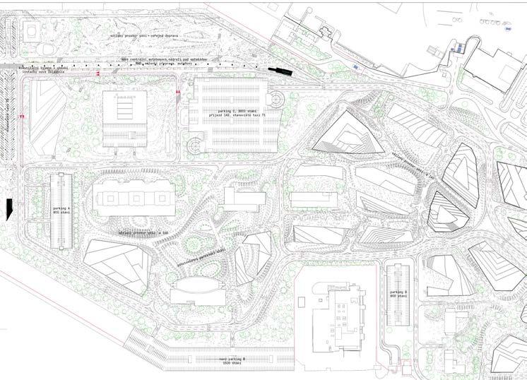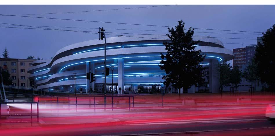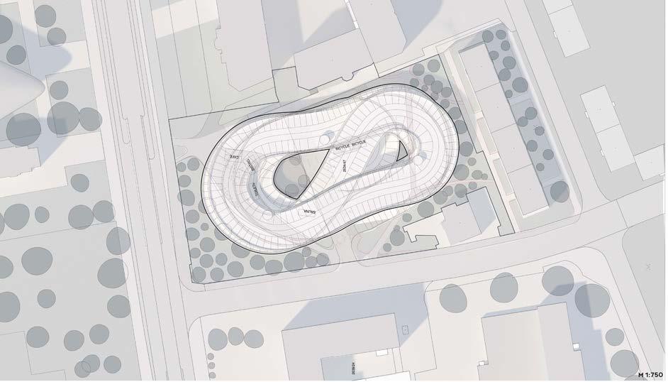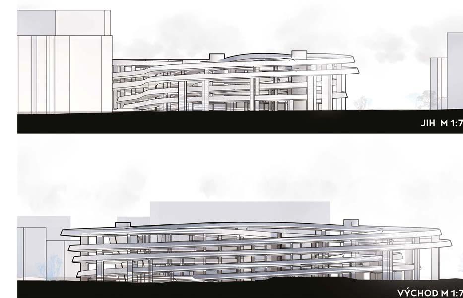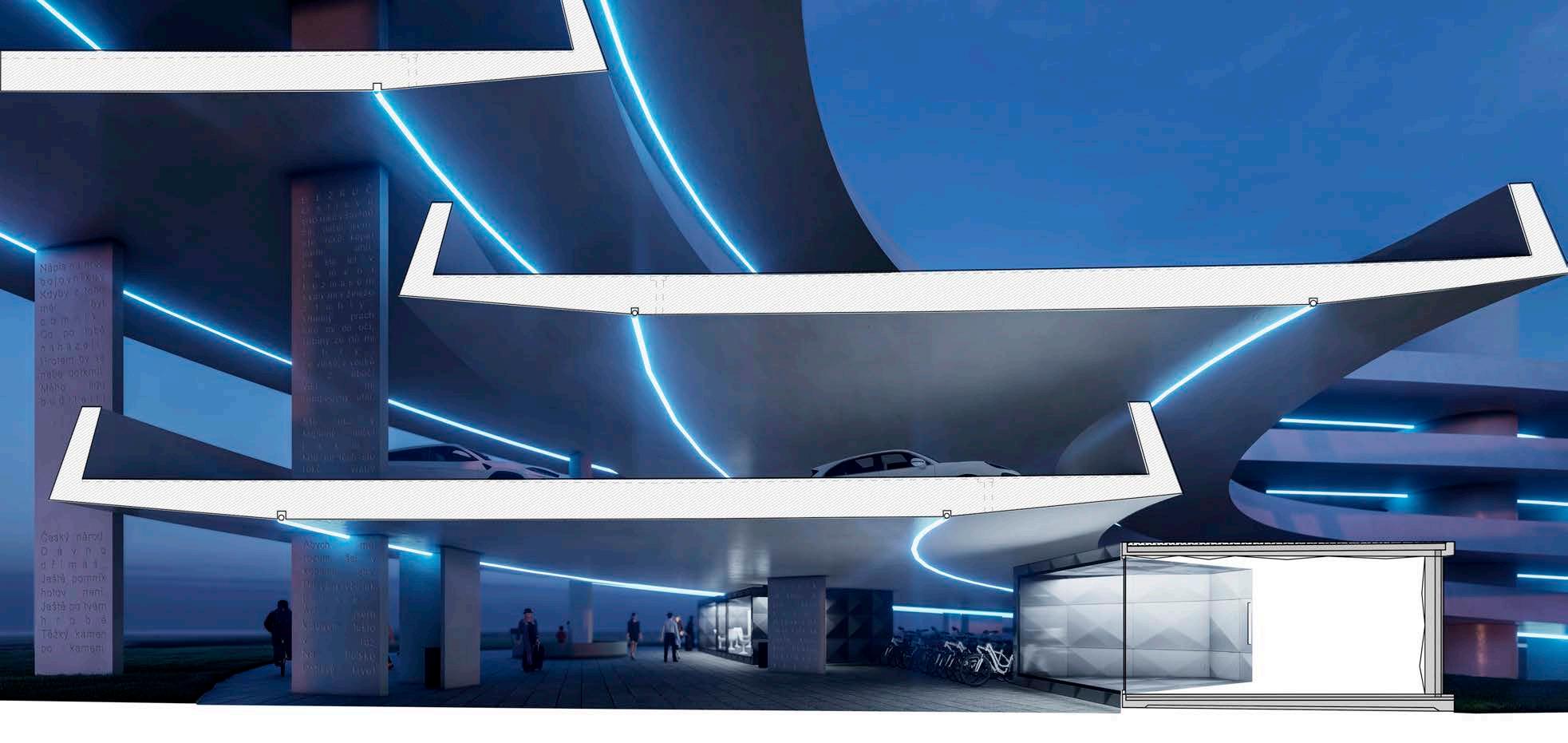Considering the concept of a new parking house in Ostrava, we were concerned with two main theses. 1. What is the essence of a parking house and 2. how it affects its surroundings? We came to the conclusion that the essence of a parking house is a simple road and parking slots. The resulting open structure of the “track” does not close and fill the space with impenetrable objects, but naturally coexist with the place. The resulting art form consciously refers to movement, mobility, speed and semiotically refers the importance and program of the object. As a result, it is clearly read and positively complements the urban structure the context of the place where its openness communicates with the opposite park, its graceful curves guides the pedestrian and its cantilever pull communicates with the Steven Holl Opera building.