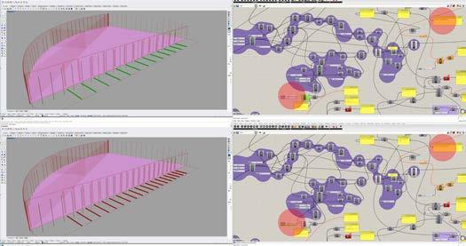 The original design envisioned a flat site, but after surveying the terrain, the project was adapted to a slope. Thanks to parametric design, this transition was seamless. By rotating slabs along the YZ axis and defining columns from slab points, the geometry remained consistent. The parametric model also generated various façade and opening configurations, optimizing for ventilation and headlight containment. Elements like crash barriers, walls, and columns were modeled in Rhino and imported into Archicad, with continuous real-time visual checks in virtual reality to ensure architectural quality.