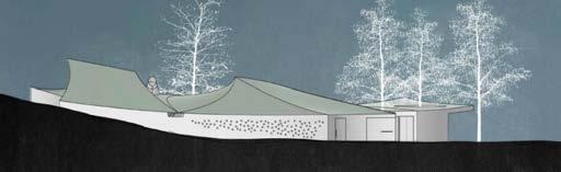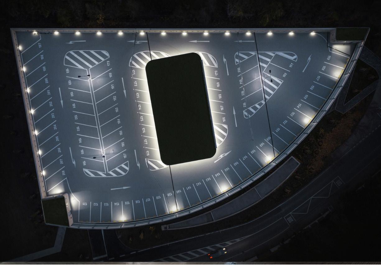 Two-storey building with mobile roof allows parking up to 200 cars. It forms a triangle with a convex side, using the slope of the land and respecting the slope of the terrain. The layout of the house is divided into parking spaces with a ramp and communication cores. The facade from the north is formed by road barriers with a ventilation function and a high aesthetic experience. The facades of the east and south are concrete with small air vents in a diverse pattern and will grow with ivy and local plants. The LED illumination placed on the crash barrier of the northern façade refers to the long exposure of the passage of cars.