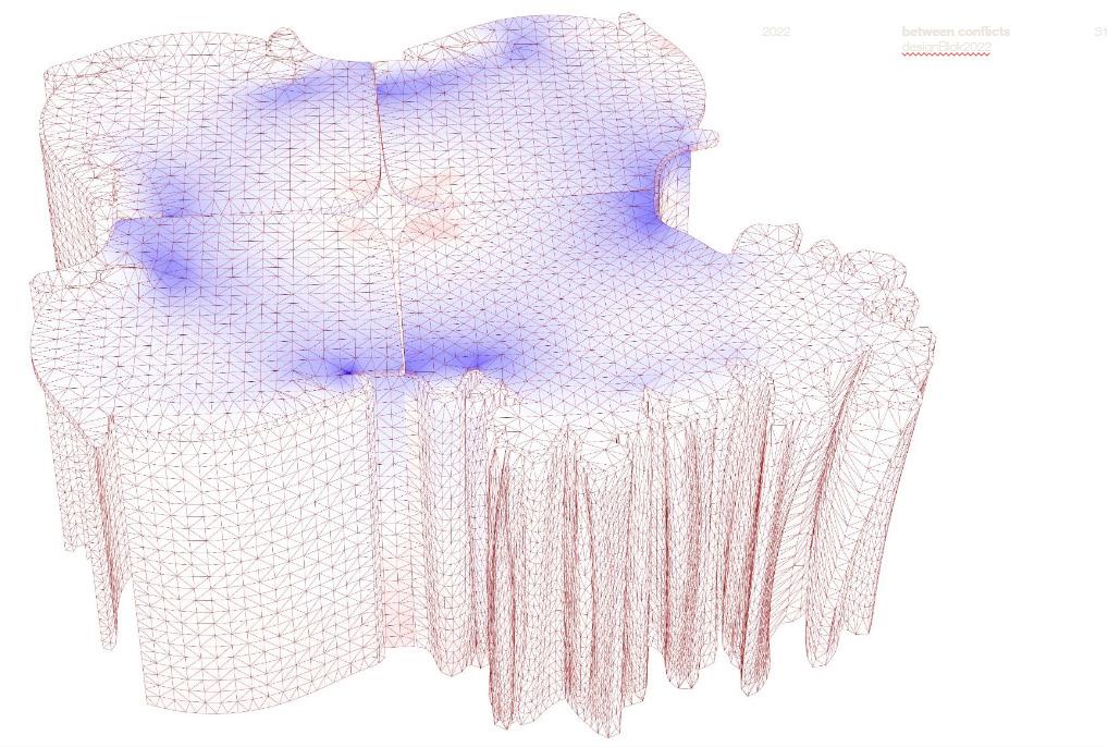 The Between Conflicts object, which we exhibited in the garden of the Museum of Decorative Arts in Prague, is based on a modular system of elements. Within the exhibition pavilion, the object was contextualised and adapted to refer to defensive buildings, but also to respond to the architectural and socio-political context. The core elements of our Modesty system were complemented by highly articulated walls of the corrugated structure, thus connecting the building to the surrounding garden. The corrugated walls responded to the nearby fountain, playing up the space and, thanks to 3D printing capabilities, creating shapes that would have been difficult to achieve with other technologies. The ceilings were complemented with patterning that was based on structural analysis and depicts the principles of stress lines. On the floor we created patterning based on the principle of curve filling using a growth algorithm. On the walls, AI-generated patterning was used. Our concept was to test the possibilities of informed surfaces and inlays in 3D printed concrete. children hiding in the forest ..