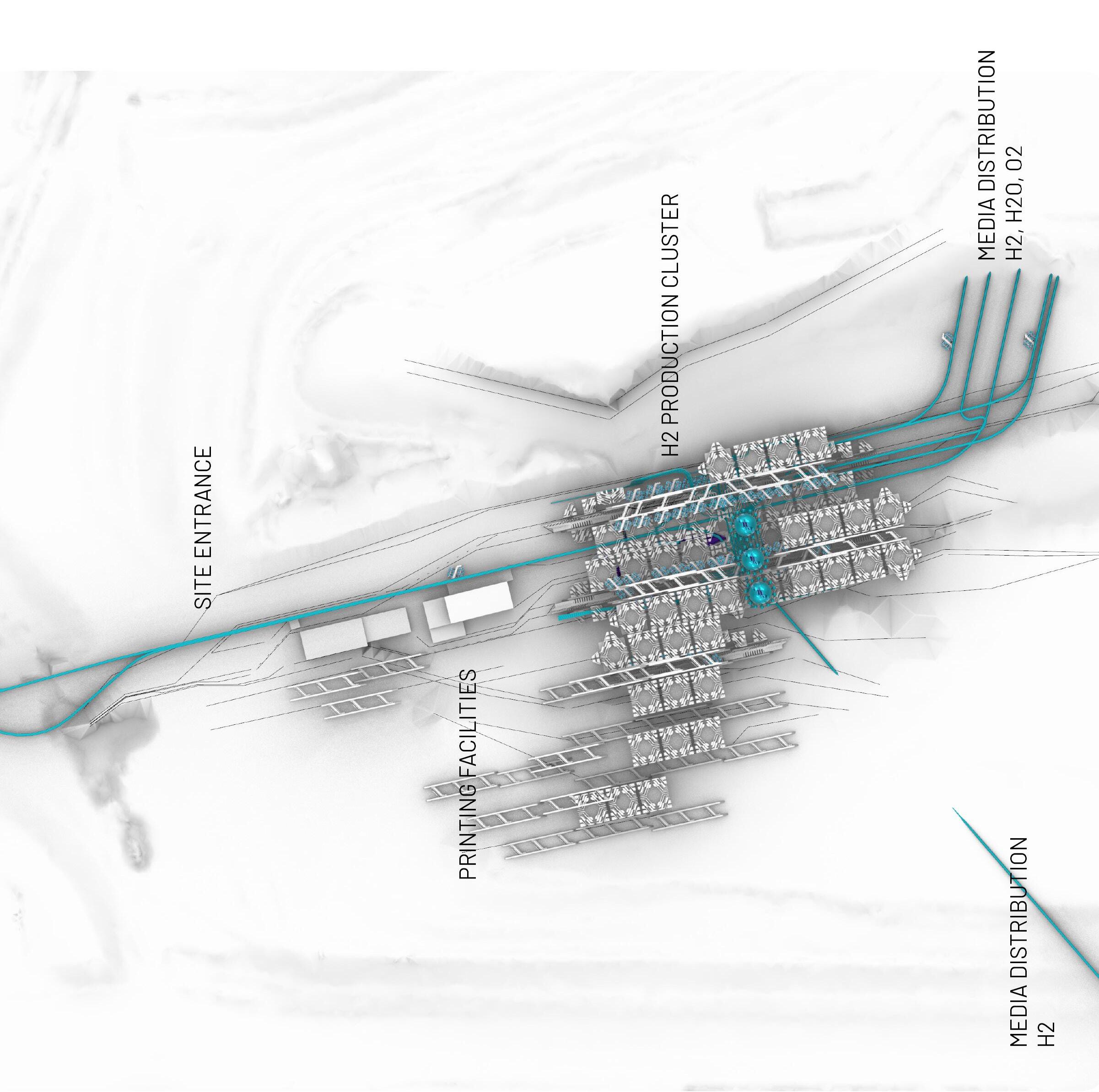 Rainwater harvested from the roof serves a dual purpose: irrigating the yards and accumulating in a pond. Greywater undergoes a filtration process, directed to a root treatment plant for reuse in flushing systems. Solar energy is harnessed by panels, converted into hydrogen batteries, and seamlessly retrieved as required. The cluster’s guiding principle is cooperation, optimizing energy and water consumption and storage through a universal approach that enhances efficiency, overstepping individual house-centric strategies.