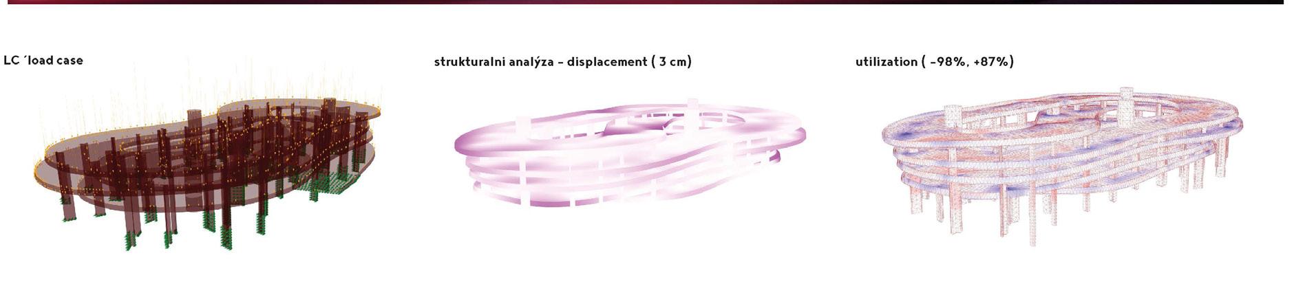 The limit of the possible building area was defined and subsequently the points in space defined the ramp curve. Optimization was important to ensure underpasses and appropriate ramp slopes. Thanks to that it was created the very artistic shape of the whole mass of the object. The parking geometry was then generated along with the curve home. The escape cores were suitably positioned to meet the required distances. Given geometry was then analyzed statically. Parking spaces have been digitally positioned to avoid columns and the minimum parking width was maintained.