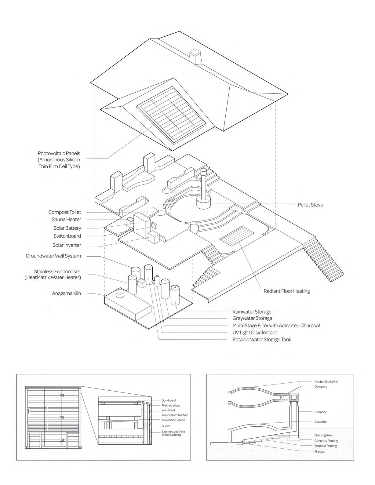 Hestian Oasis provides a sustainable forest escape from the loud, urban world for a pair of sculpture and ceramic artists. Hestian Oasis maintains net-zero energy through the use of both a wind turbine and photo-voltaic panels, and maintains a net-zero water system with local groundwater sources and the filtration of rain and gray water. It is passively heated through the combined recycled heat of an anagama kiln, sauna, and pellet stove and retains heat through the curving cave-like walls and the thermal masses of the residence.