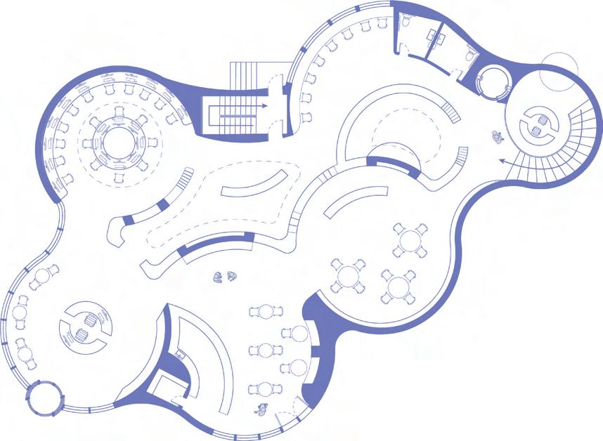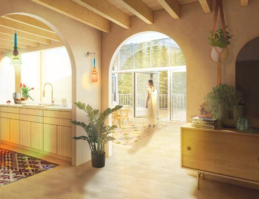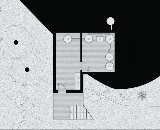 Hestian Oasis builds a connection between its spacious patios that connect the kitchen and access to the kiln room down in the basement. unique geological formations, notably mimicking These walls are built with local pine wood, abundant within. The floor, steps, and built in bench nooks though cut into modular hexagonal tiles to ease