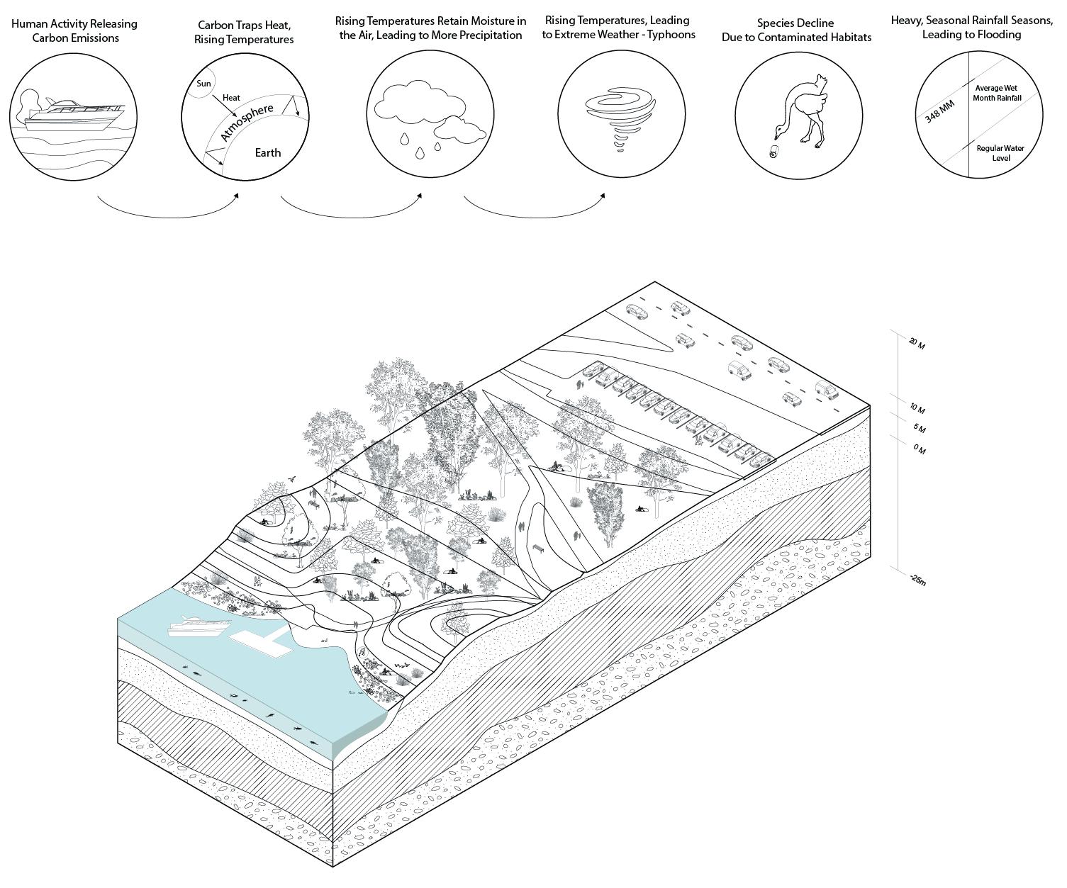 Yanghwa Hangang River Park, located in Seoul, South Korea, faces yearly flooding due to heavy seasonal rainfall and a myriad of climate related issues. 1.5 to 1.3 billion EUR is projected to be spent annually in repairing damages from riverline flooding in South Korea, with estimates of 0.9 to 4.5 billion EUR in costs by the end of the century. Specific design interventions using bioretention techniques are proposed to better divert flooding away from busier infrastructure, effectively using the park as a barrier against the urban setting of Seoul.