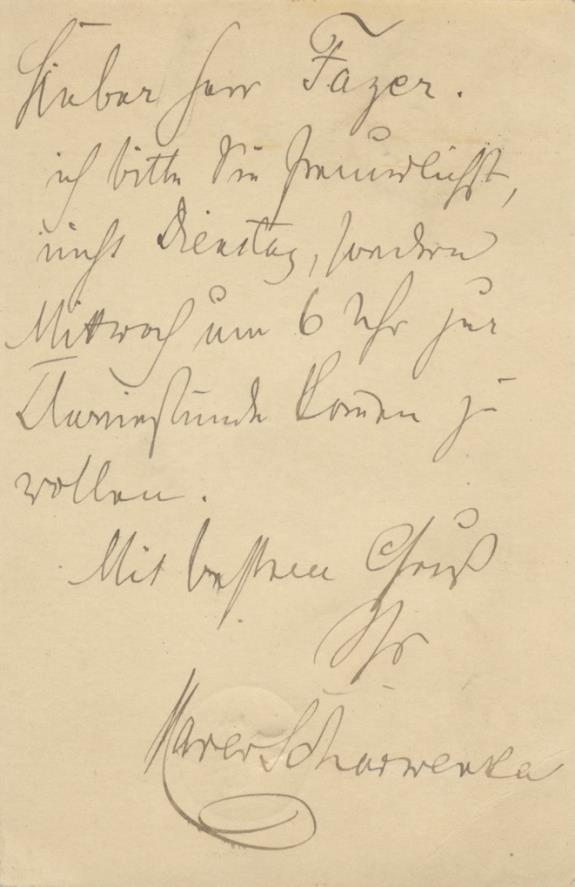 With an autograph note signed to verso dated Vienna, September 24, 1936, addressed to the Colombian musicologist Otto de Greiff. With Bittner's return address stamp in purple ink to upper left corner, "Julius Bittner, Wien IX, Dietrichsteingasse 10."