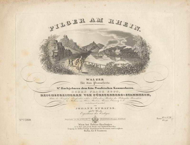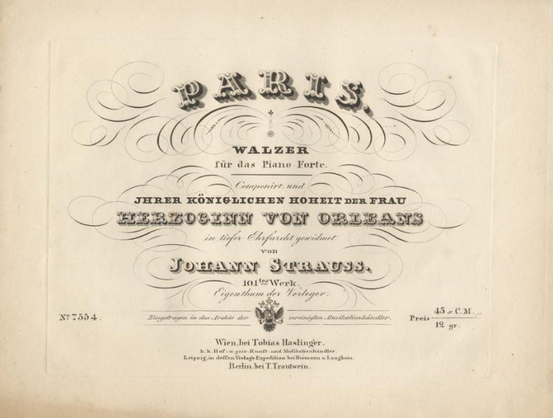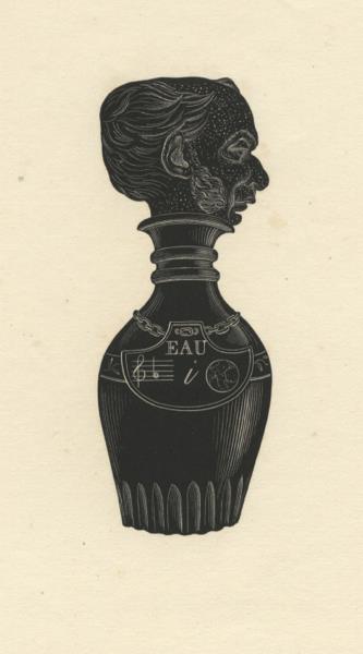 109 x 41 mm. plus wide margins. An interesting and unusual image after Dantan's bronze bust. Carafa's head, in profile, is depicted as the stopper in a bottle of cologne, decorated with a plaque on a chain, withinwhich are the word "eau," amusical note (g), the letter "i" anda circular object (aglobe?), formingarebus which, decoded, reads "Eau Solitaire," an allusion to Carafa's opera Le solitaire of 1822. Very slightly browned at edges.