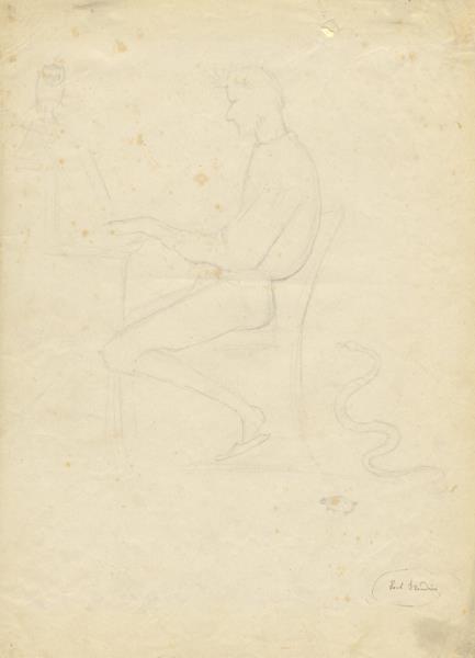 Ca. 310 x 225 mm. Thomas is depicted seated at the piano, an owl perched on top of the instrument, a snake and turtle behind the composer. On wove paper. Signed by the artist at lower right in ink. Some light foxing and wear; small hole to upper right quadrant not affecting drawing.