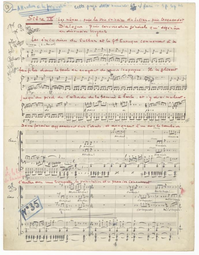 2 pp. Folio (ca. 348 x 268 mm). 56 measures scored for both spoken and sung voices, including sections for chorus with instrumental accompaniment. Apparently complete. Marked "Scène IX les mêmes: puis les trois emissaires du Sultan - puis Croquendot " Notated in black and red ink with some markings in blue crayon. Unsigned. Slightly worn; creased at central fold.