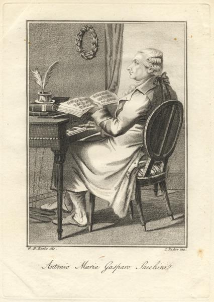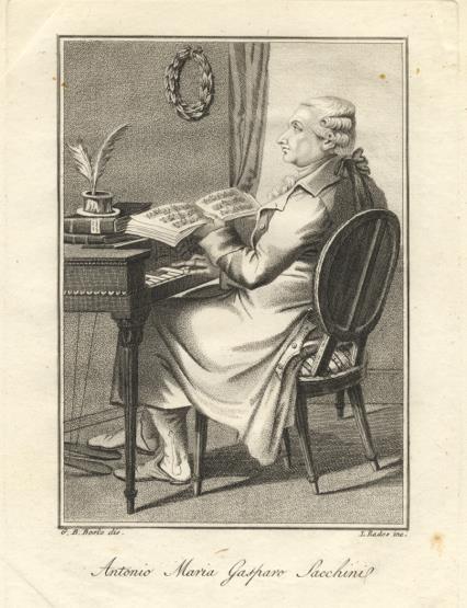 220 x 155 mm. Sacchini is depicted full-length, seated at a keyboard instrument with pedals, a book of music in his left hand, his right on the keyboard.