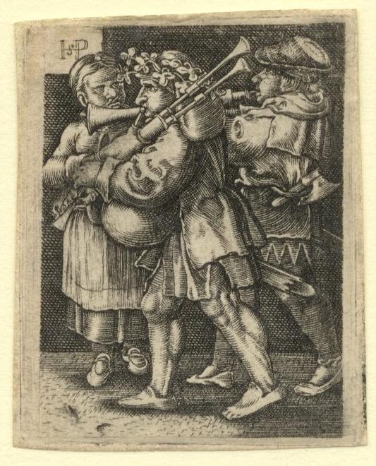 Fine 16th century German engraving after Hans Sebald Beham (1500-1550) depicting two male musicians intently playing the bagpipes and shawm or bombard while a woman looks on.
