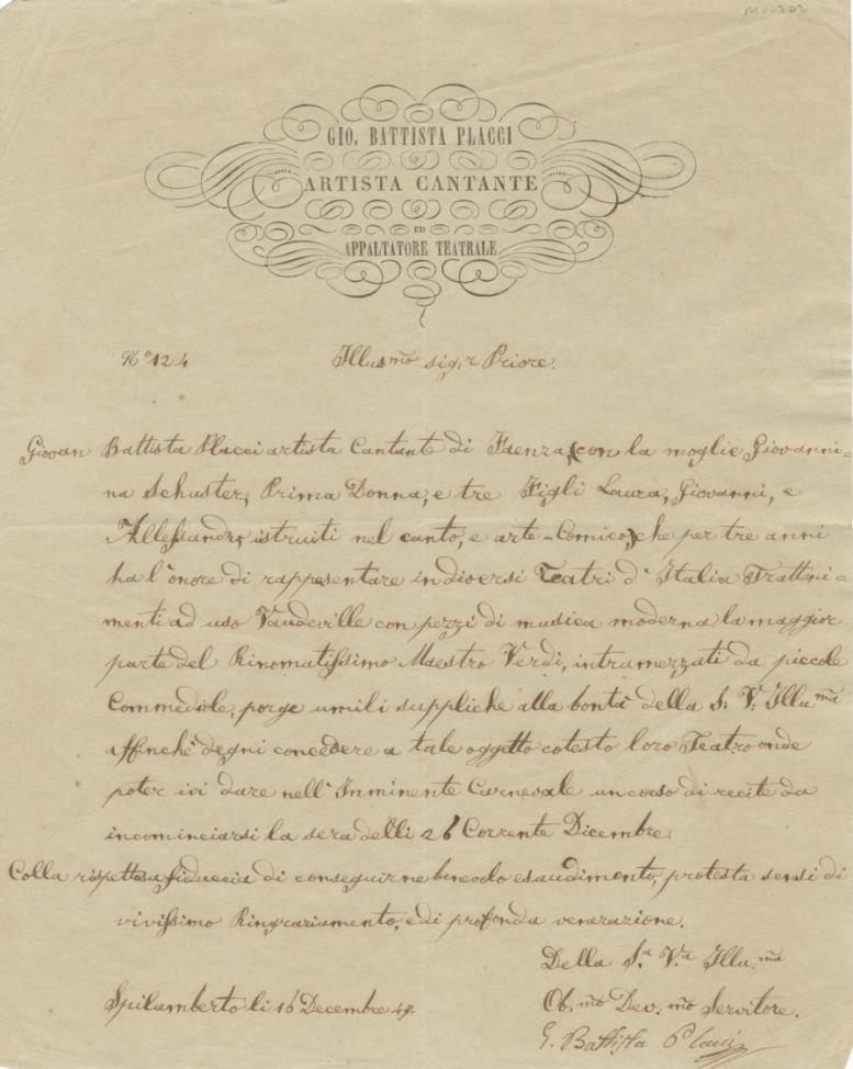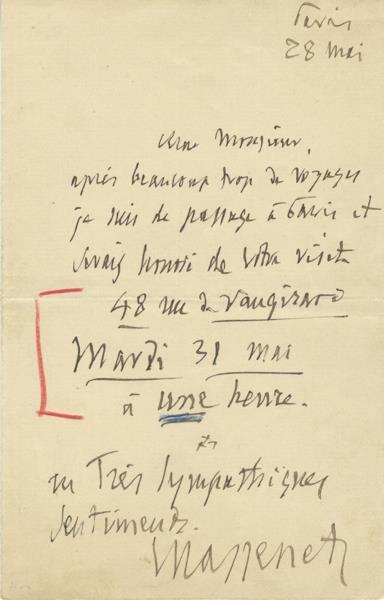 Autograph letter signed to Monsieur Génio at the Opéra Comique in Paris.