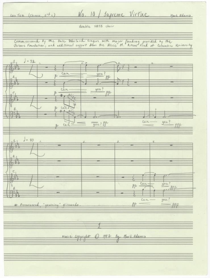 Autograph Musical Manuscript, With Text from the Tao te Ching in the Hand of “One of America’s Most Formidable Lyric Composers”