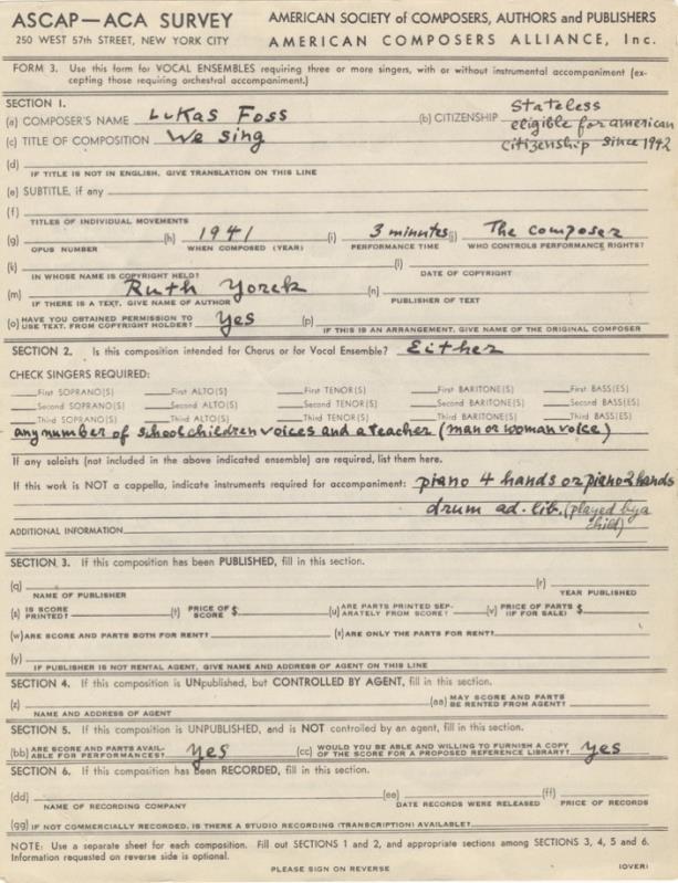 Printed ASCAP form relative to Foss's choral composition We Sing, signed and completed in manuscript by the composer.
