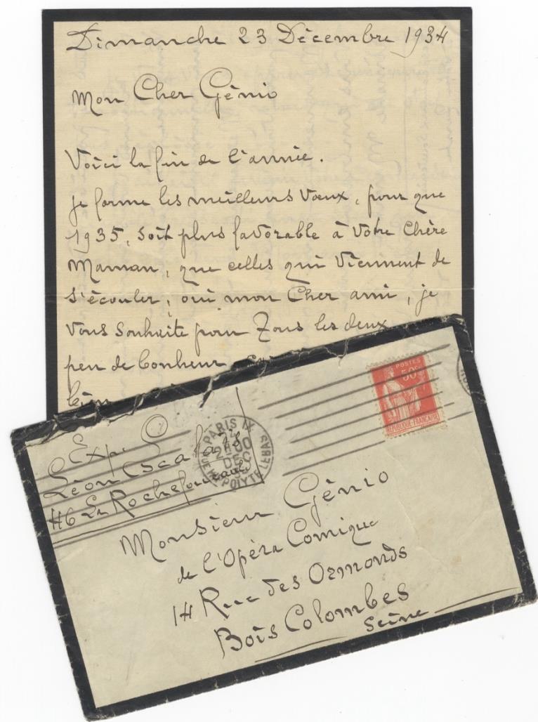 Escalaïs sends his best wishes for 1935 to Génio and his mother, mentions a role in Mon Ami Pierrot which "Sacha Guitry very much wanted" him to get, and a meeting with the director of the Opéra Comique and the composer Barlow. Very slightly worn; creased at folds.