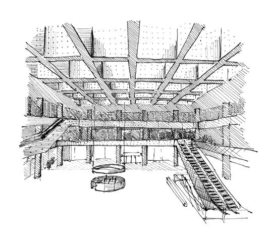 The headhouse becomes support system for the community, acting as a career and business incubator. The space extends into the main drill hall of the armory, assimilating more with the interior marketplace.