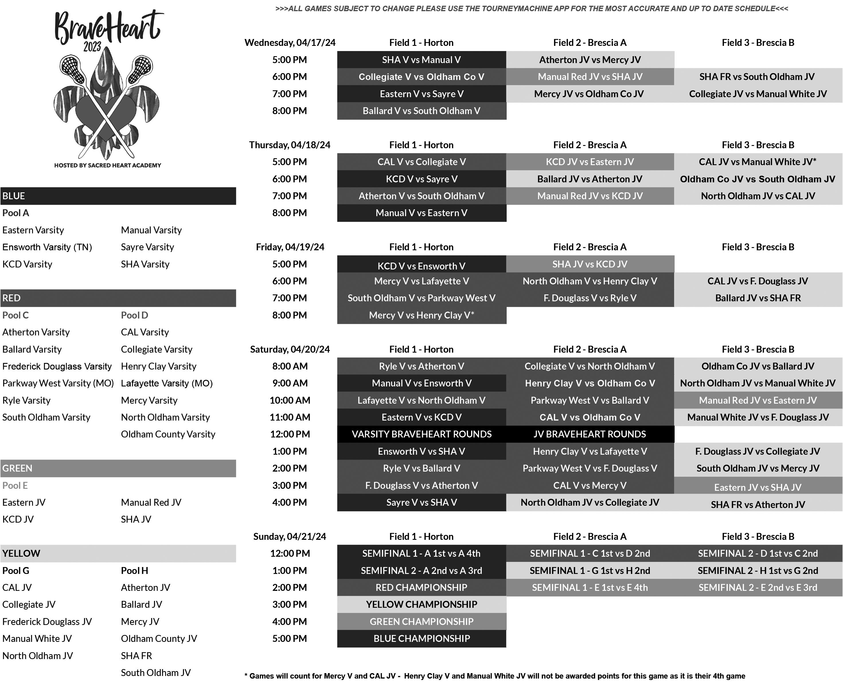 • TourneyMachine will be utilized to maintain the official schedule for the 2024 BraveHeart Tournament. The schedule printed here and in the program is for ease of use only, and is subject to change.