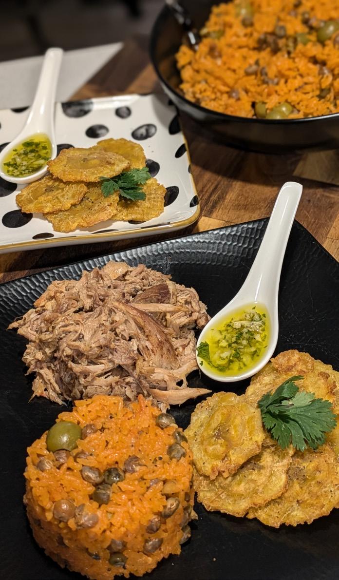 6. Serve: Shred the meat, break the cuerito into pieces, and serve immediately with the arroz con gandules and tostones!
