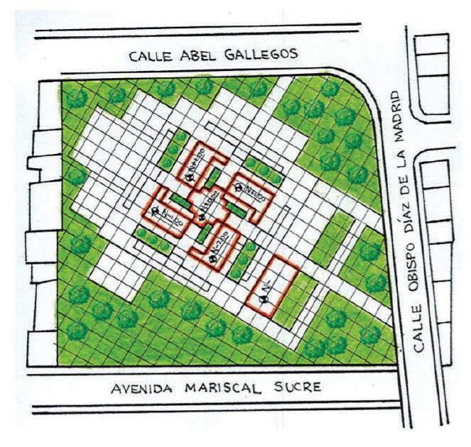 El estudio del terreno, permite analizar que el sitio presenta una pendiente inclinada, 3 líneas de trasporte, en los tres ejes viales, una coperativa de taxis "Las casas" en la calle Abel Gallegos, 2 paradas de buses en la calle Obispo Díaz de la Madrid y en la avenida Occidental, el terreno posee condiciones y características preexistentes como un área de afectación, un bosque con abundante vegetación, construcciones aledañas, juegos infantiles, una cancha de fútbol y una estación de comida temporal.