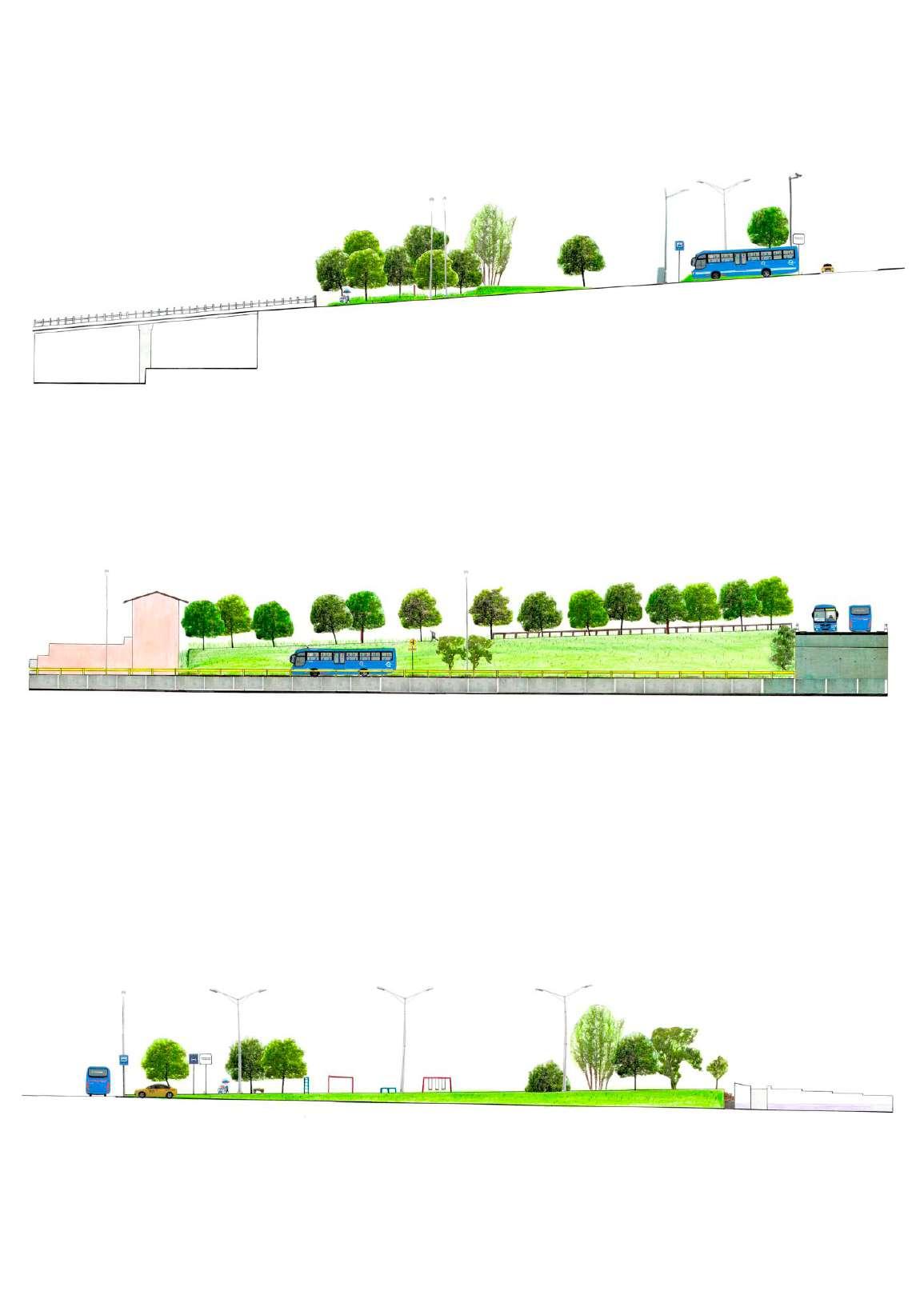 El proyecto presenta un elemento central denominado glorieta de la cual se distribuyen mediante rampas a las 4 plazas a diferentes niveles, en las cuales se integra la vegetación dentro de la arquitectura.