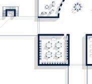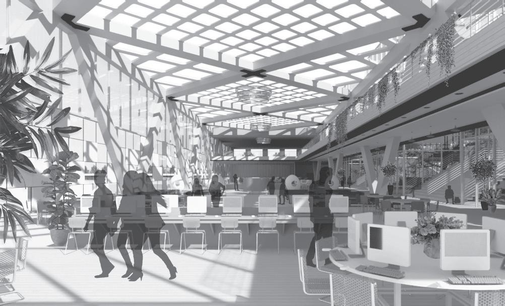 The entrance atrium acts more like a large vestibule where students circulate as they make their way to and from their classroo ms and other school facilities. The double height sky light expands the space and lets light in. This is a transitional space that connects the cafeteria, the lower-level courtyard and th e path to the classroom towers.
