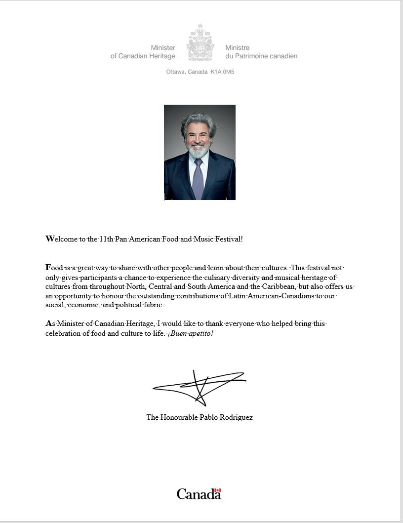 I am pleased to extend my warmest greetings to everyone attending the 2023 annual Pan American Food and Music Festival This event offers a wonderful opportunity to celebrate the richness, beauty and diversity of North, Central and South America and the Caribbean. I am certain that the many performances and activities planned for this celebration will be enjoyed by everyone in attendance. I would like to commend the Pan American Food and Music Festival for its hard work in organizing this year’s event and for its commitment to promoting cultural exchange. Please accept my best wishes for a memorable festival