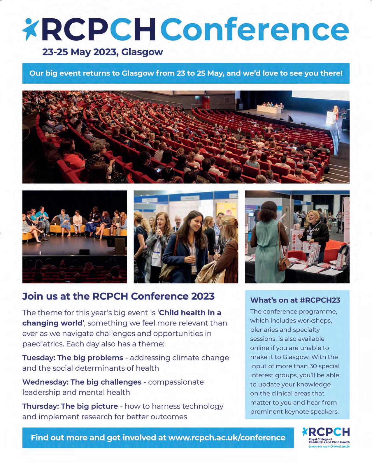 The RCPCH Conference in Glasgow from 23-25 May will be a guaranteed antidote to burnout and misery. I’ve been privy to some of the planning committee meetings and can assure you that programme plans, as well as the wider social calendar, are not going to disappoint. There is an eye-watering selection of science, clinical medicine, wider professional topics and then just the downright funky, fun and crazy too! So be there or be square!