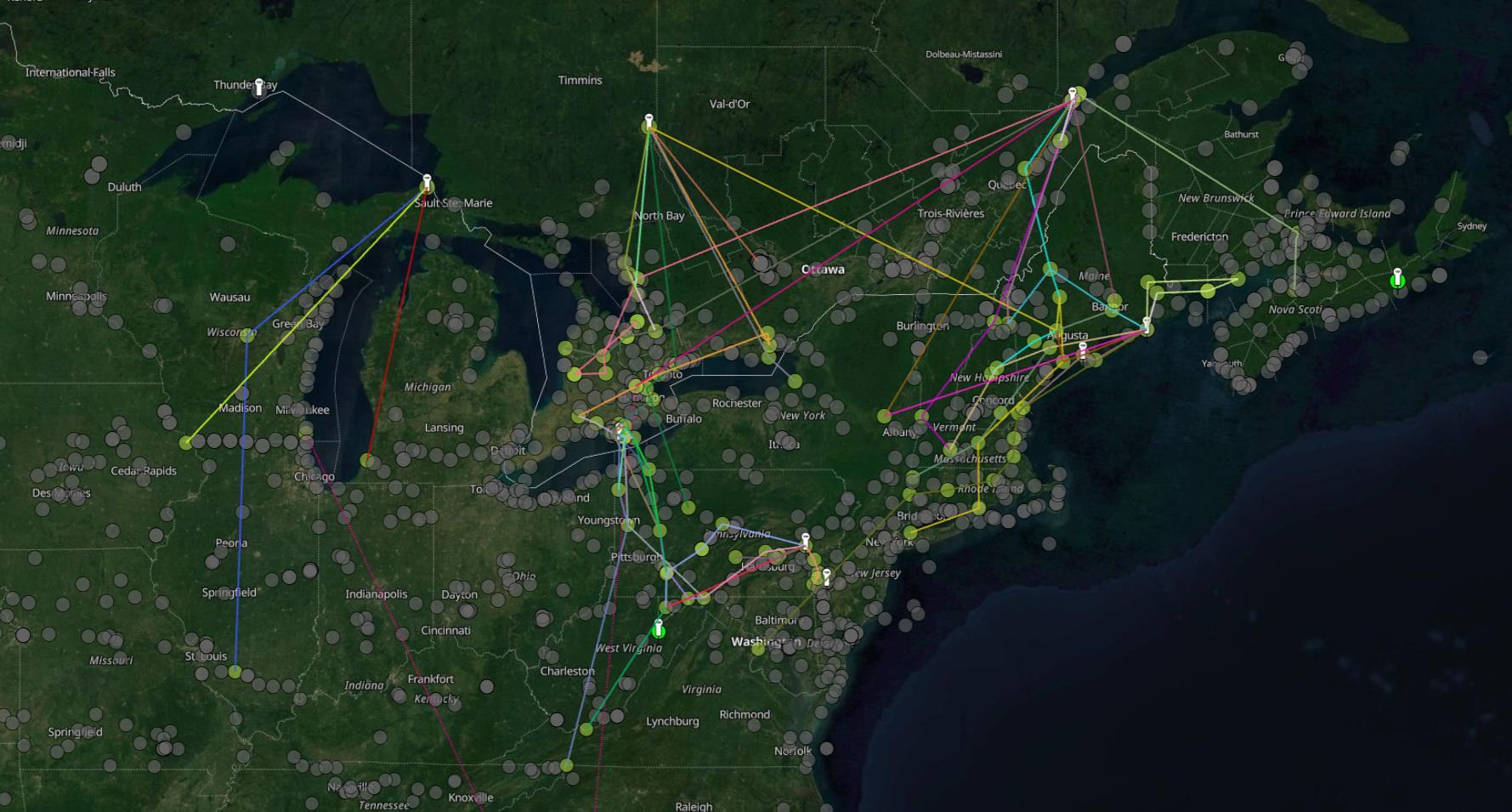 Tracks of Northern Saw-whet Owl movements between Motus receivers during the autumn of 2024. Small white Nanotag symbols are tagging locations, lime-green dots are detections of owls that did not move away from their banding locations, and yellow dots are detection locations. Screen-captured from motus.org on 2 Jan 2025.