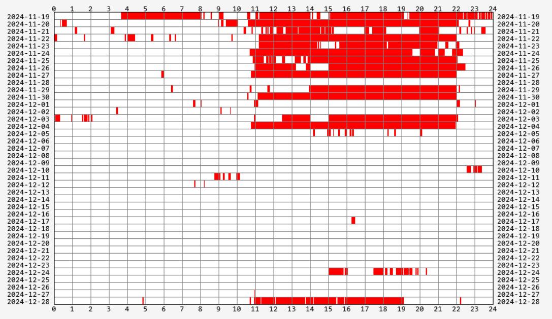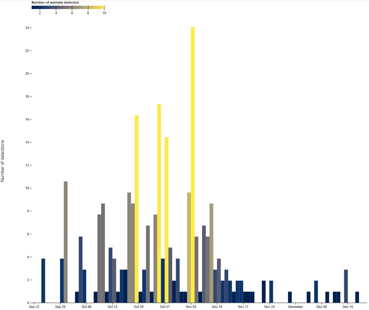 A histogram of Northern Saw-whet Owl movement timing derived from Nanotag detections during the autumn of 2024. The bar color reflects the number of individuals detected; see the small scale in the upper left corner of the graphic. Screencaptured from motus.org on 2 Jan 2025.