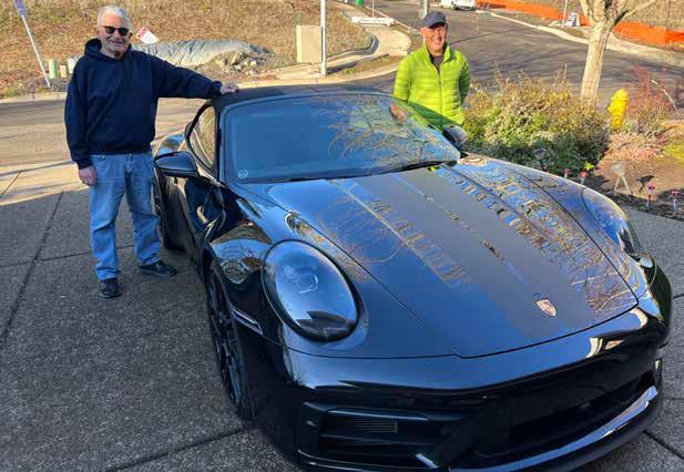 FUN: Joe Sweeney and Jerome Deluz enjoying their new 2023 911 4GTS Cabriolet. They brought it over to Eric and Peg’s home to show us how it came out. We loved the subtle stripe up and over the soft top! Gorgeous black!