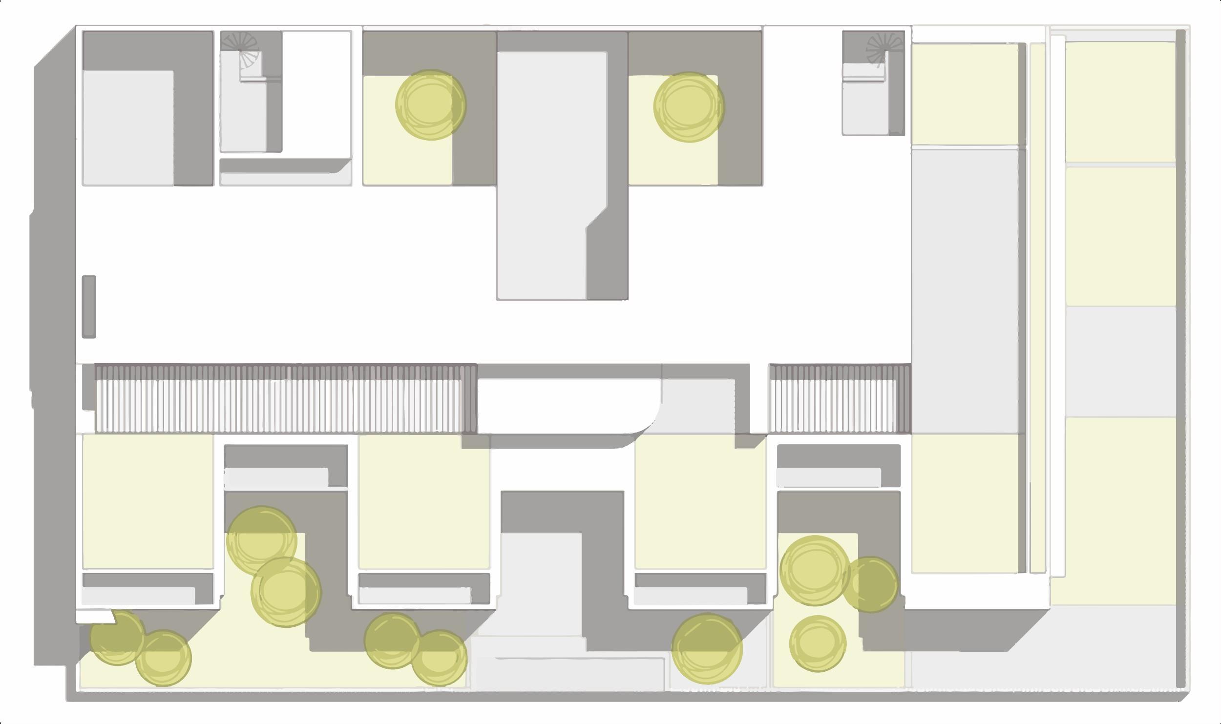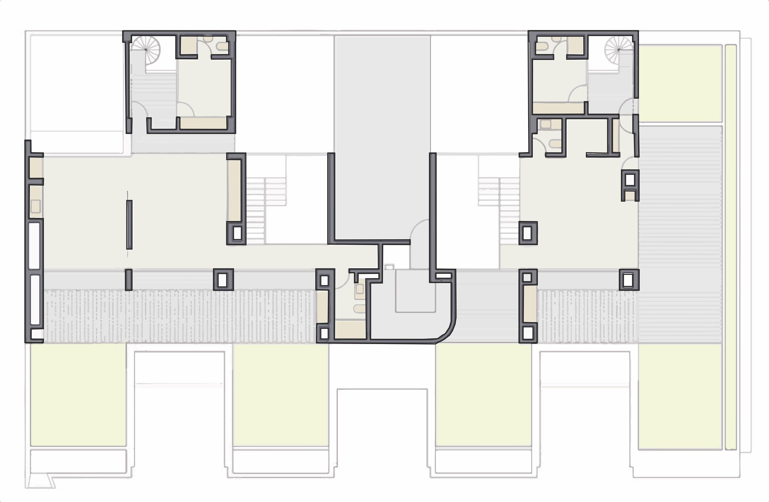 El concepto del edificio es desfase de barios bloques, Creando espacios y generando