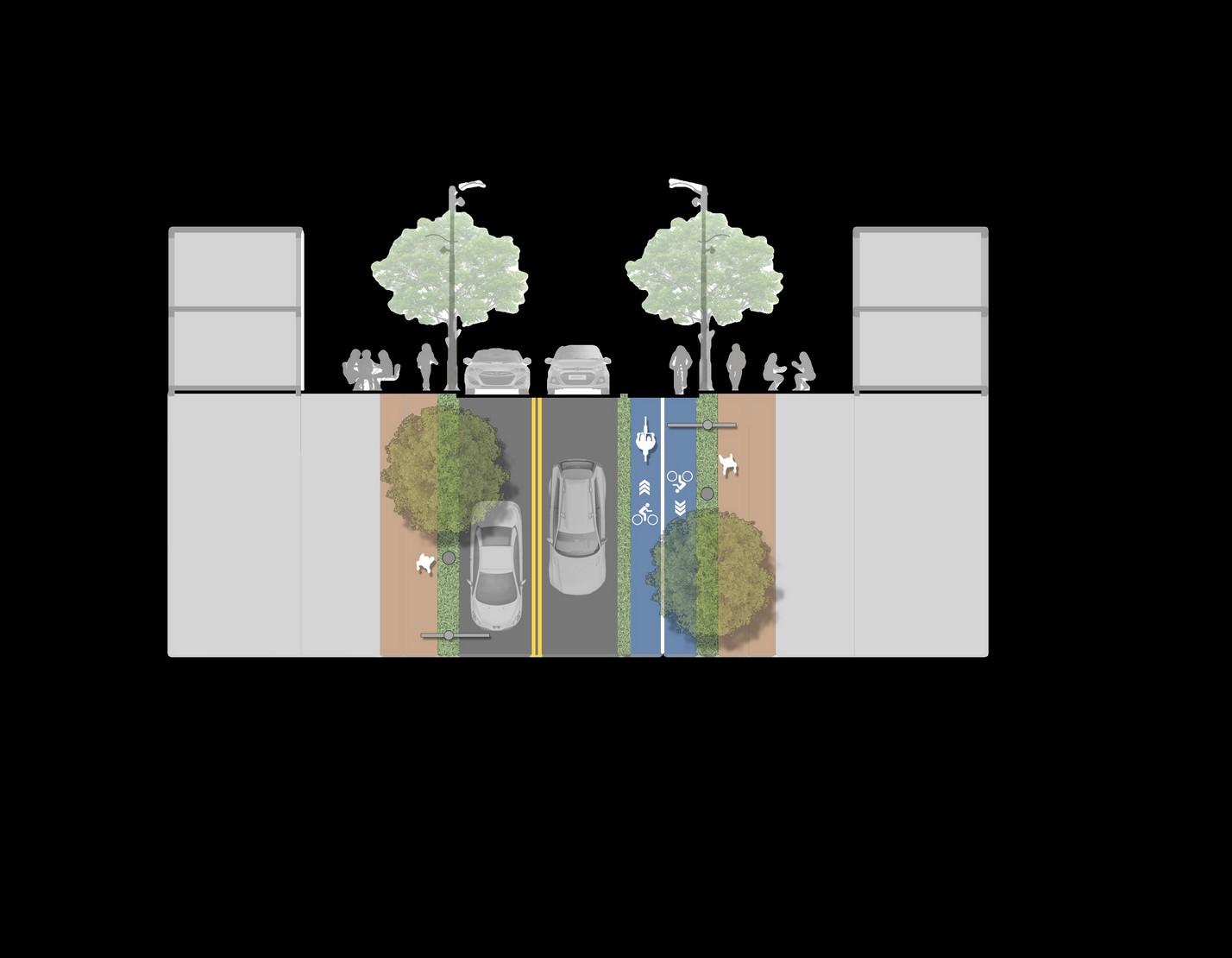 Fachada lateral hacia la Av. Coronel Reynaldo dotando una calle de doble carril con una bermacentral.
