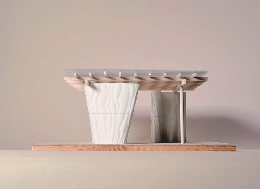 The rain Gallery pavillion was proposed as a part of a coopetition for Borås Municipality. The project consists of a 6x6 meter modular pavillion constructed from 3D-printed columns made of wood-based filament, supporting a timber lattice roof clas with translucent acrylic sheet roof. Designed as a permanent structure for art exhibitions, the pavillion is conceptually rooted in its location in Viskans Park, adjacent to an existing art gallery. The Rain Gallery invites visitors to experience art through the presence of rain, making rainfall an active component of the exhibition by engaging the sense audibly, visually, and physically.