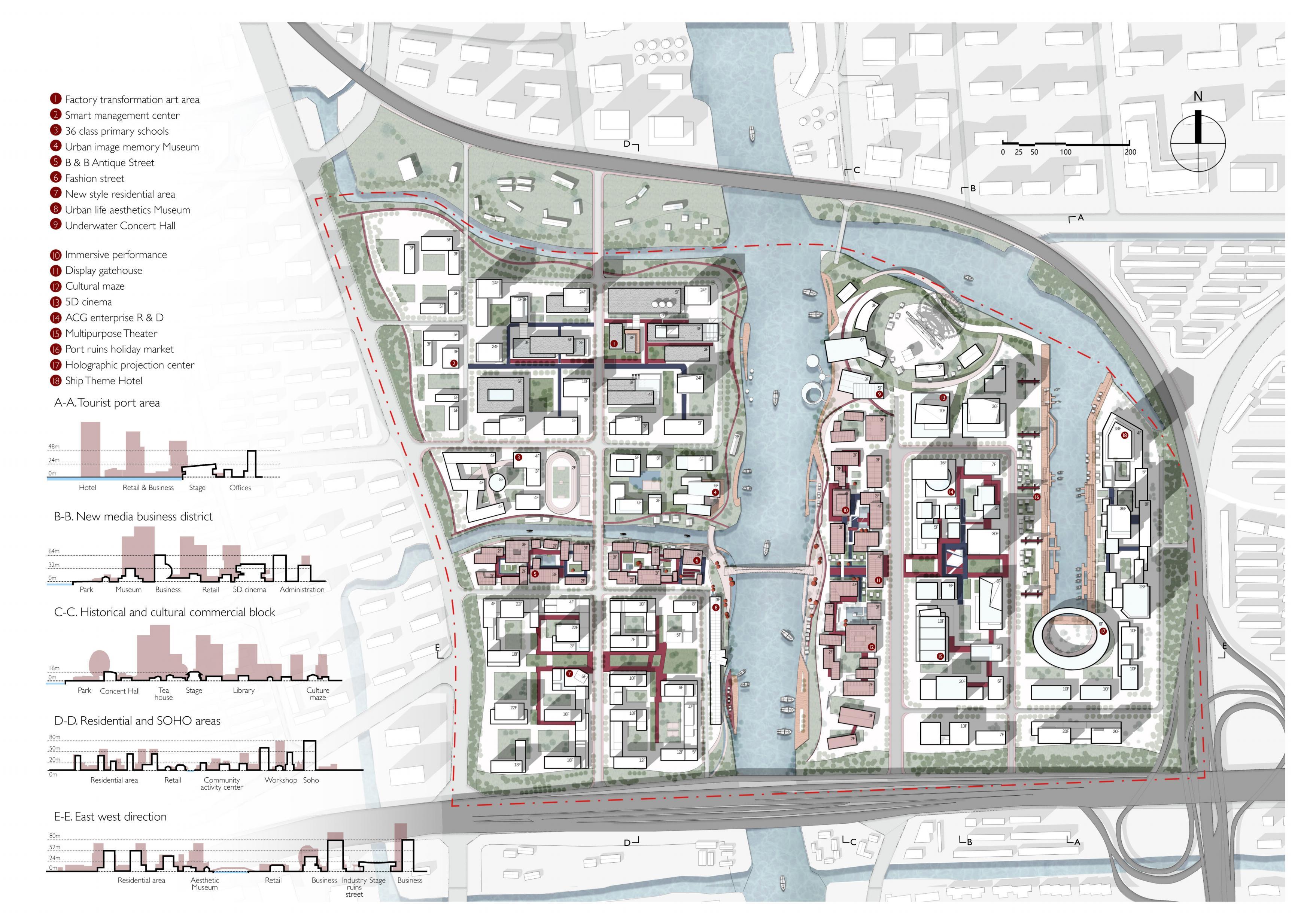 Add small docks and design water bus routes for tourism. Add a green park where music festivals can be held.Add a Ferris wheel, retail huts and other amusement places around the water on three sides of the site, and create a carnival atmosphere and provide performance spaces