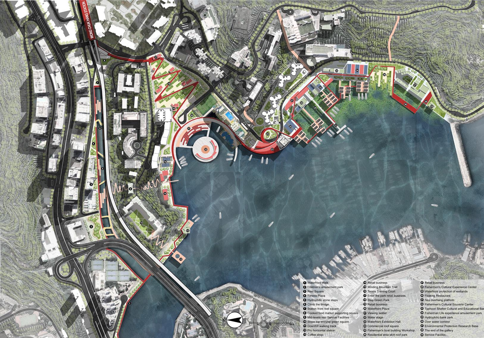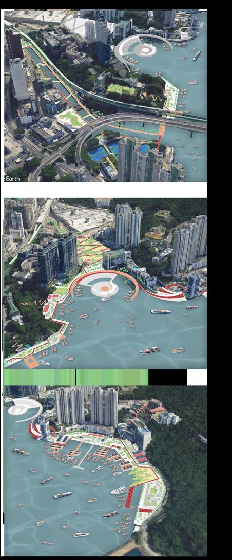 Wong Chuk Hang is a place sandwiched between two mountains. My plot is in the west of Wong Chuk Hang, which is a piece of waterfront. My theme is neighborhood to the waterfront. The main functions of the area are a new residential area, a yacht club, a group of ship building plants and an office park. There are various kinds of waterfront space within the plot, but the accessibility and continuity of the waterfront area are poor, which is also the most critical problem to be solved in this design. At the same time, the land area that can be used and used for activities is not large, because the slope fluctuation of Wong chuk hang is large.